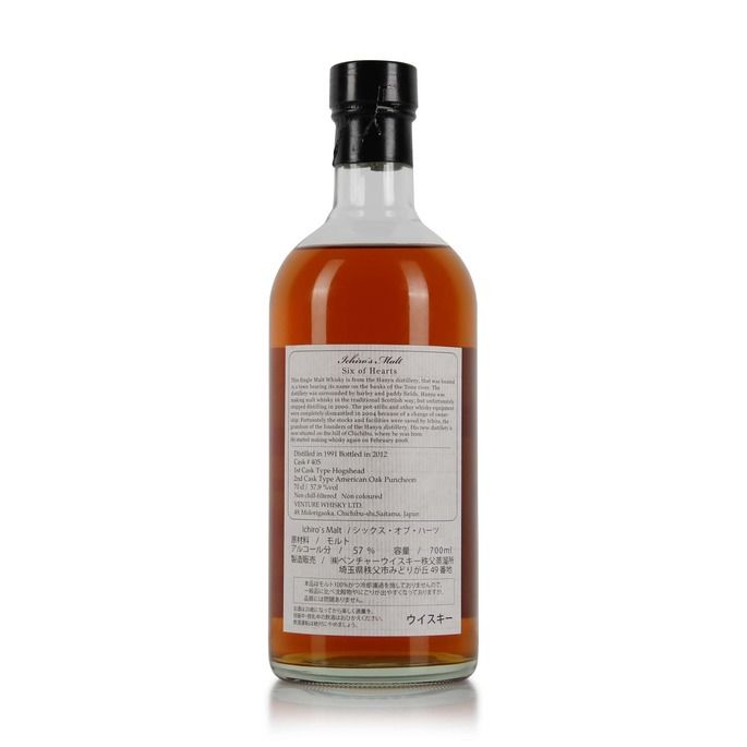 A 1991 vintage single cask expression of the closed Japanese distillery Hanyu. This bottle forms a part of the "Card Series", a collection of Hanyu bottlings produced by Ichiro Akuto of the Chichibu distillery. The card series has become one of the most sought after sets of bottles in the world. This lot is the six of hearts, a 1991 vintage cask matured in a 1st fill hogshead. It was then transferred to a 2nd fill American oak puncheon. It was bottled in 2012 at 57.9% Abv. You can read more about the card series in an article previously published by AWA: https://www.australianwhiskyauctions.com.au/news/the-ichiros-card-series-and-the-hanyu-legacy