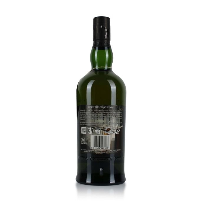 The 2015 released Ardbeg Supernova, is a heavily-peated single malt, matured in ex-bourbon casks as a committee release. No box included