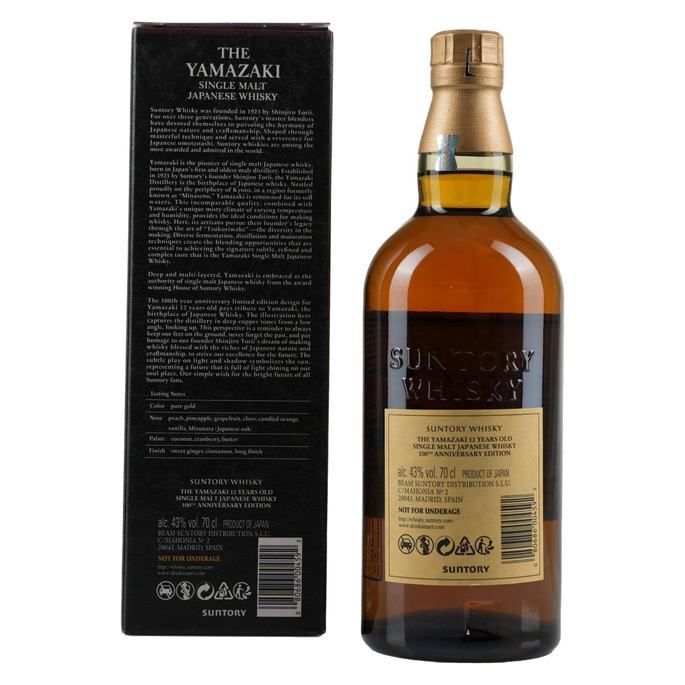 A 12 Year Old expression of single malt whisky from the Yamazaki distillery in Japan. This special edition celebrates 100 years of Suntory's whisky production, first starting in 1923 at the Yamazaki distillery. Suntory has gone on to be one of the world's premier whisky producers and were the true pioneers of whisky in the Japanese market.