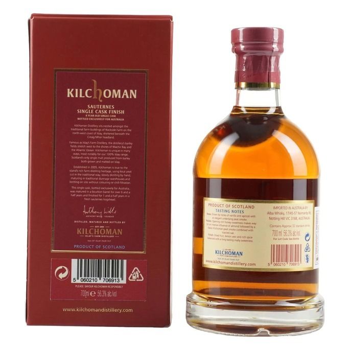 Kilchoman 2014 Single Cask 14/1007 Release Sauternes Finish is a single malt Scotch whisky from the Kilchoman Distillery on Islay, Scotland. This whisky was distilled in December 2014 and initially matured for just over six and a half years in a fresh bourbon barrel. It was then finished for 18 months in a Sauternes wine cask and bottled exclusively for the Australian market in March 2023. It is bottled at 56.3% ABV