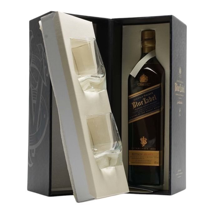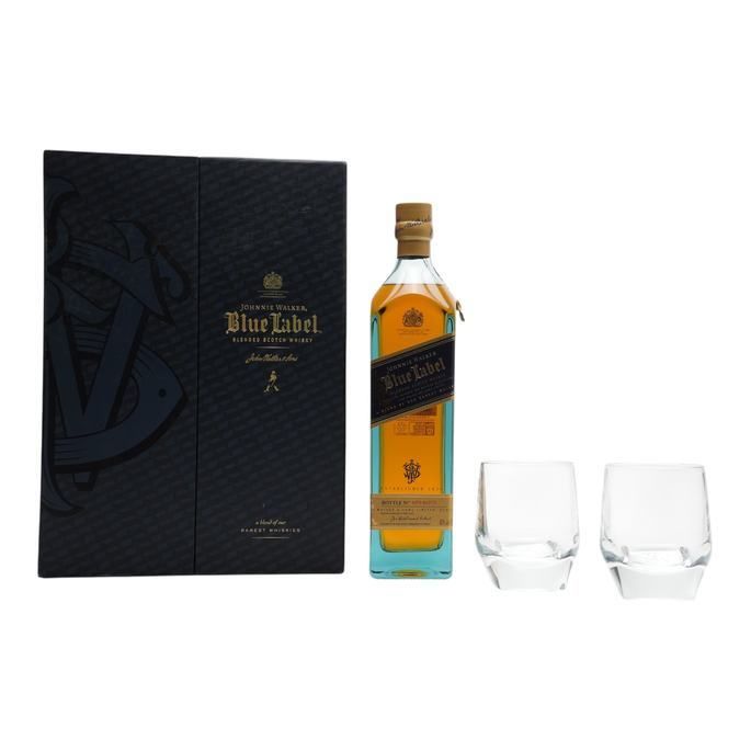 A Johnnie Walker Blue Label gift set with 2 tumblers included alongside a 750ml bottle of Blue Label.