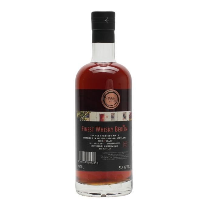 A 1993 vintage single cask expression of a secret Speyside distillery indicated to be Macallan based on the painting of their signature Easter Elchies house on the label. Matured for 27 years in a sherry cask and bottled at 51.4% ABV for Finest Whisky Berlin by German bottler Sansibar.