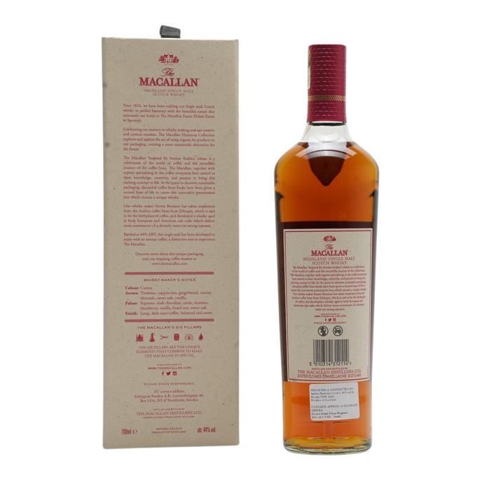 The second bottling in a new line of releases for Macallan, the Harmony Collection aims to bring more sustainability to Macallan's top tier whisky. The packaging for this edition utlises discarded coffee bean husks. The arabica edition takes inspiration from Ethiopian Arabica coffee beans. Head whiskymaker at the Macallan Steven Bremner collaborated with Ethiopian grower Kenean Asefa Dukamo, Scottish roaster Lisa Lawson and acclaimed American barista Andrea Allen. The Intense edition of the Arabica release is a 44% version.